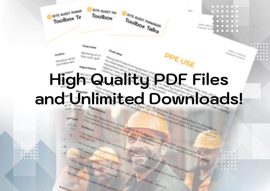 Toolbox Talks are designed to be short and informative (to the point) and is a presentation to the workforce on a single aspect of health and safety. All of our Toolbox talks are in convenient PDF format so that you can get going as soon as possible and are created to save you time and effort. We will soon be adding more formats available such as Powerpoint and Video. All of our Toolbox Talks are priced as little as £1.20 each (for unlimited downloads!) or take advantage of our TBT Packs.